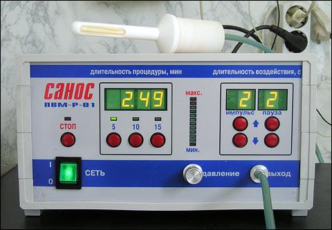 Длительность импульсов и пауз, а также величина давления подаваемого воздуха и время процедуры регулируется электронным блоком управления.