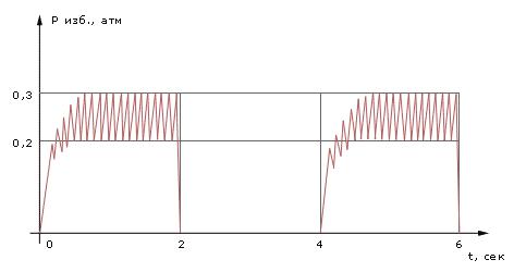 Пневмовибромассаж осуществляется при помощи ректального наконечника, имеющего щелевидную прорезь, устанавливаемую на уровне предстательной железы. В наконечнике помещен пневмобаллон, во внутреннюю полость которого от пневмонасоса под давлением импульсами подается воздух. Пневмобаллон под действием подаваемого воздуха ритмично выходит за пределы ректального наконечника через щелевидное отверстие и оказывает на простату довольно мягкое механическое воздействие (массаж), имеющее две составляющие: 1) строго дозируемое давление на простату с плавным нарастанием и спадом его силы и 2) низкочастотную вибрацию, как показано на рисунке.