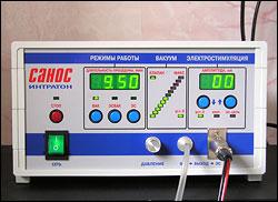 Аппарат АЭ-01-"Санос" состоит из блоков вакуумной аспирации и электростимуляции. Для дренирования простаты к ней по уретре подводится специальный тонкий электрод-катетер (процедура безболезненна), который подсоединяется к блоку вакуумной аспирации аппарата и создается строго дозируемое ритмичное разрежение (отрицательное давление + низкочастотная вибрация). В результате через выводные протоки железы отсасывается воспалительное содержимое (гной и "пробки") пораженных долек органа. После полной "очистки" простаты она стимулируется (как, например, сердце) электроимпульсами блока электростимуляции того же аппарата (назначается электростимуляция уже на этапе восстановительного лечения). Эффективность лечения значительно увеличивается при сочетанном использовании обоих блоков аппарата, который позволяет проводить одновременно и откачку содержимого долек и электростимуляцию гладких мышц простаты с целью восстановления их тонуса. Кроме того, трансуретральная электростимуляция играет важную роль в восстановлении половой функции мужчины, т.к. при этом стимулируется семенной бугорок и задний отдел уретры, являющийся важнейшей "пусковой" эрогенной зоной. Значительная часть больных во время такой процедуры испытывают небольшие эротические ощущения. Для усиления лечебного эффекта, повышения его эффективности и сокращения сроков лечения на обоих этапах применяются также различные аппаратные физиотерапевтические методики и лекарственные средства.